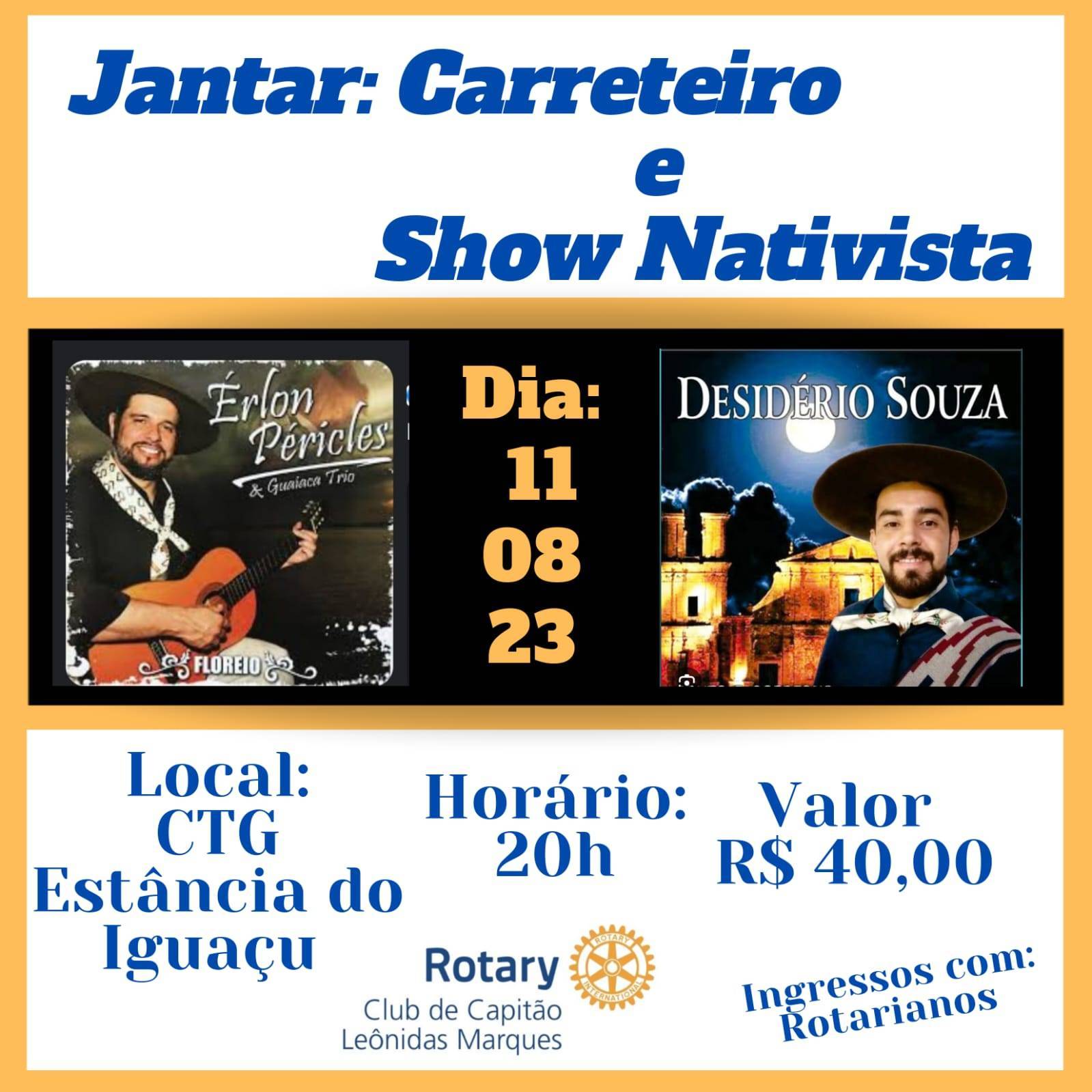 No dia 11 de agosto, o Rotary Club de Capitão Leônidas Marques promoverá um show nativista com as apresentações de Érlon Péricles e Desidério Souza, acompanhado de um delicioso Jantar com o tradicional cardápio Carreteiro!