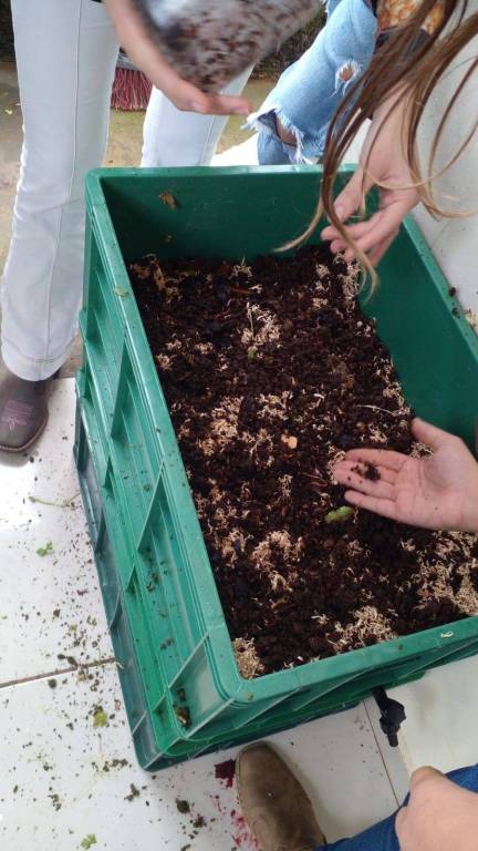 Já com relação a composteira, esta será utilizada na escola para fins de reciclagem de resíduos orgânicos oriundos do refeitório da escola e da horta, através do processo de compostagem destes resíduos aliado a com a ação de minhocas que ao consumirem os restos orgânicos produzem um composto muito fértil que será reutilizado na horta para adubação do solo onde produzirá novas hortaliças.