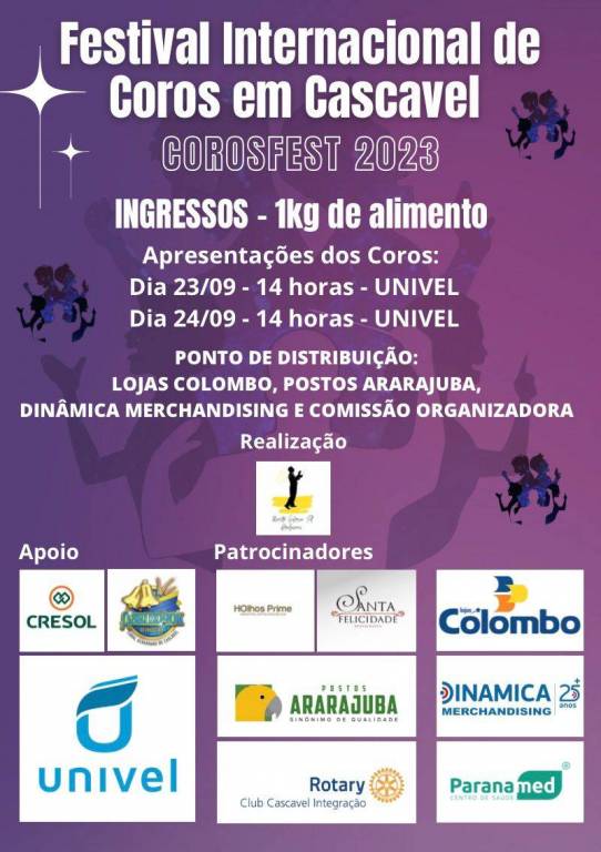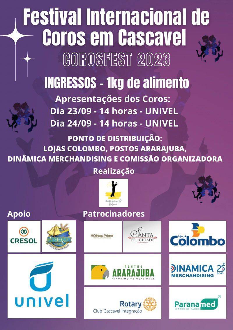 Foi realizado nos dias 23 e 24 de Setembro de 2023, no anfiteadro da UNIVEL em Cascavel-PR, o 2o Festival Internacional de Coros que reuniu 11 coros de outros estados e também do Paraguai. Entre os participantes teve o Coral de Itaipu Binacional, Coral Municipal de Araucária, Coral da Fundação Cultural e o Coral da Copel de Cascavel.