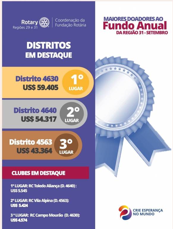 Para alegria do clube, ao receber o informativo mensal, 3° edição de setembro de 2023, nosso distrito 4640, está em 2° lugar como maior doador do Fundo Anual.