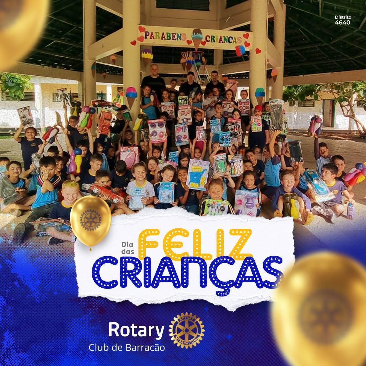 O Rotary Club de Barracão para festejar o dia das crianças dia 11/10/2023 promoveu festa para aproximadamente 150 crianças na Escola Érico Veríssimo. No evento foram entregues presentes a todas bem como alugado diversos brinquedos para o divertimento. O projeto da continuidade a outro projeto maior, o de Pascoa Solidaria, onde o Club confecciona e distribui aproximadamente 1.000 ovos as crianças da rede pública de ensino.
