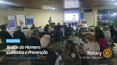 No dia 17/10, o Rotary Club de Cascavel teve o prazer de receber o médico urologista, Dr. Fabrizio Barbosa, para uma palestra sobre Saúde do Homem. Associados e convidados se reuniram para aprender mais sobre pontos cruciais na saúde masculina, com foco especial na prevenção do Câncer de Próstata.