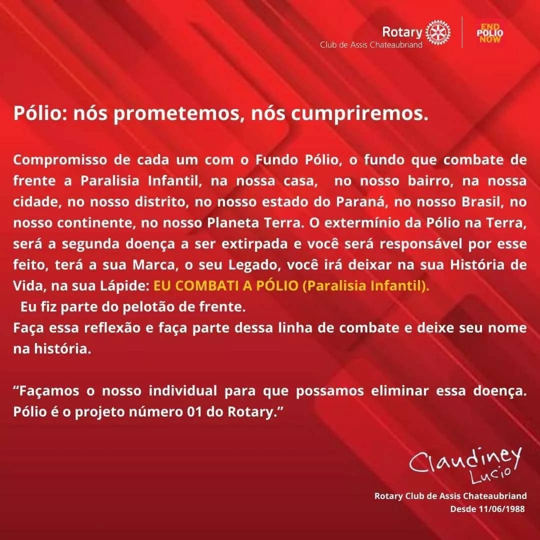 Compromisso de cada um com o Fundo Pólio, o fundo que combate de frente a Paralisia Infantil, na nossa casa, no nosso bairro, na nossa cidade, no nosso distrito, no nosso es-tado do Paraná, no nosso Brasil, no nosso continente, no Planeta Terra. O extermínio da Pólio na Terra, será a segunda doença a ser extirpada e você será responsável por esse feito, terá a sua Marca, o seu Legado, você irá deixar na sua História de Vida,