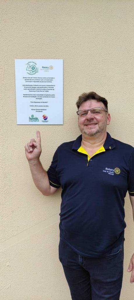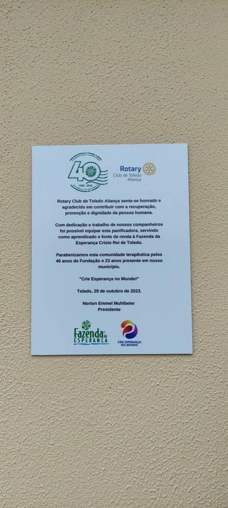 "Em nome da Fazenda da Esperança agradecemos o apoio, incentivo e colaboração deste Clube de Serviço que, mais uma vez, fez uma relevante doação para a panificadora desta comunidade terapêutica. Obrigada a todos, em especial ao Presidente Norton Muhlbeier, que, juntamente como os demais companheiros estiveram conosco neste dia memorável, que celebramos o 23º aniversário desta entidade, onde 70 pessoas estão caminhando para o resgate da sobriedade e o convívio social". Rosi Colpo.