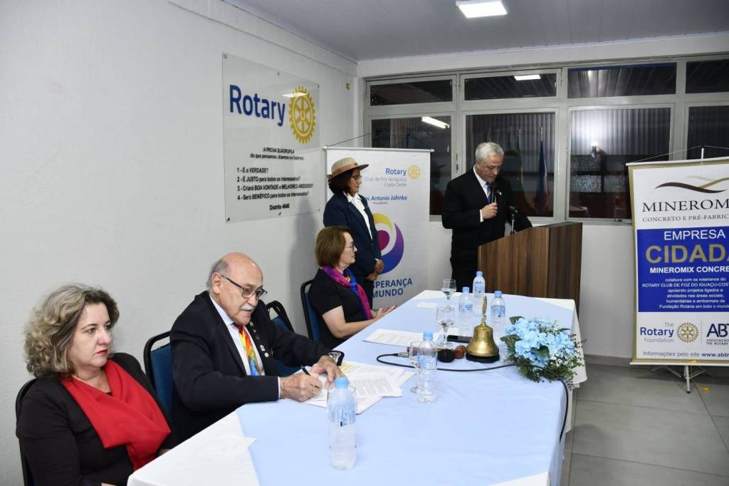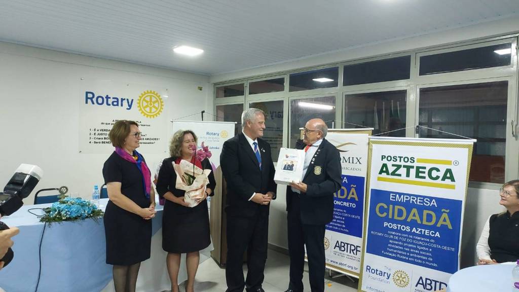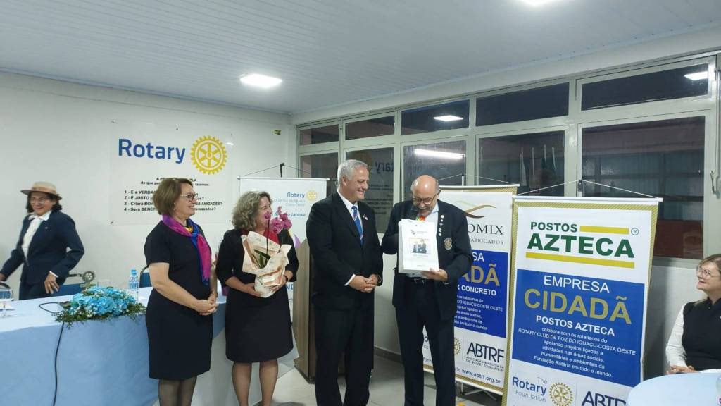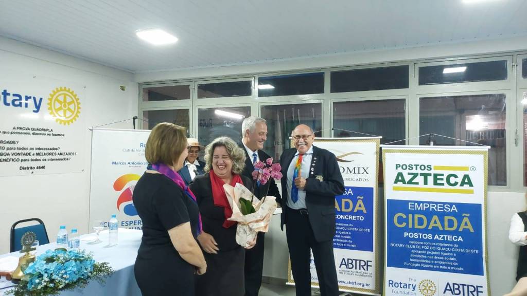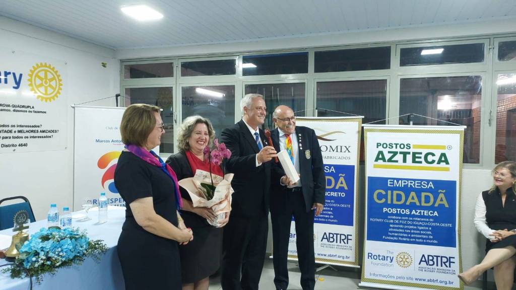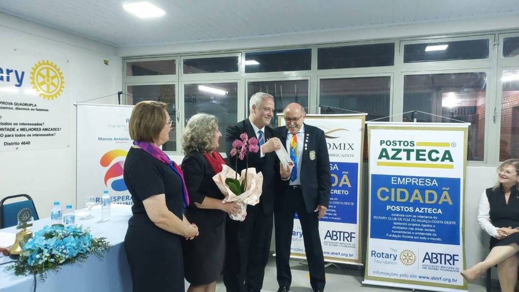 Na noite do dia 23 de novembro as 20:00 hr, aconteceu a Festiva da Visita Oficial do Govrnador do Distrito 4640 Gestão 2023-24 Antonio Da Caz e sua esposa Juciney ao Rotary Club de Foz do Iguaçu-Costa Oeste. Na ocasião muito esperada por todos companheiros do clube, tivemos a admissão de 4 novos companheiros no Quadro Associativo do clube os companheiros Cleverson José Teixeira, Maurício Pedroso Ribeiro da Silva, Gustavo Viana do Nascimento e Pedro Antonio Crocetta, sendo que o companheiro Pedro foi associado ao Rotary Club de São Ludgero (Distrito 4652) e o novo companheiro Gustavo oriundo do Rotaract de Sta Terezinha de Itaipu. Após a cerimônia de admissão foram homenageados os proprietários da empresa Mineromix, o Sr. Jonathan Barbiero na companhia de seu pai para receber o Título Paul Harrys Fellow Gestão 2022-23 oriundo de um ano na participação na ABTRF Empresa Cidadã, motivo de alegria pela entrega do título como também, pela renovação de mais um ano apoiando o Programa ABTRF Empresa Cidadã e em contrapartida homenageamos a mais nova empresa a participar do programa ABTRF Empresa Cidadã , recebendo os aplausos e agradecimentos de todos presentes em nome da empresa Rede de Postos Azteca na pessoa do empresário, Sr. Walter Venson atualmente companheiro no Rotary Club de Foz do Iguaçu. Logo em seguida o encontro festivo de companheirismo e amizade foi presenteado com um delicioso jantar acompanhado com muita alegria e descontração.
