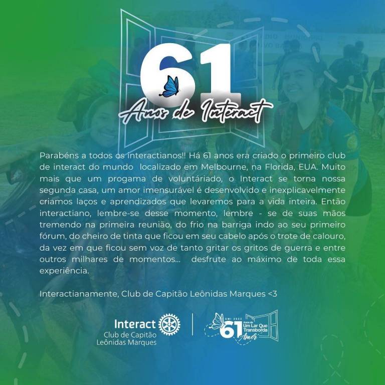 No dia 05 de novembro de 2023 o Interact completou 61 anos! Onde nessa data, em 1962 foi criado o primeiro club de interact do mundo localizado em Melbourne, na Florida, EUA.