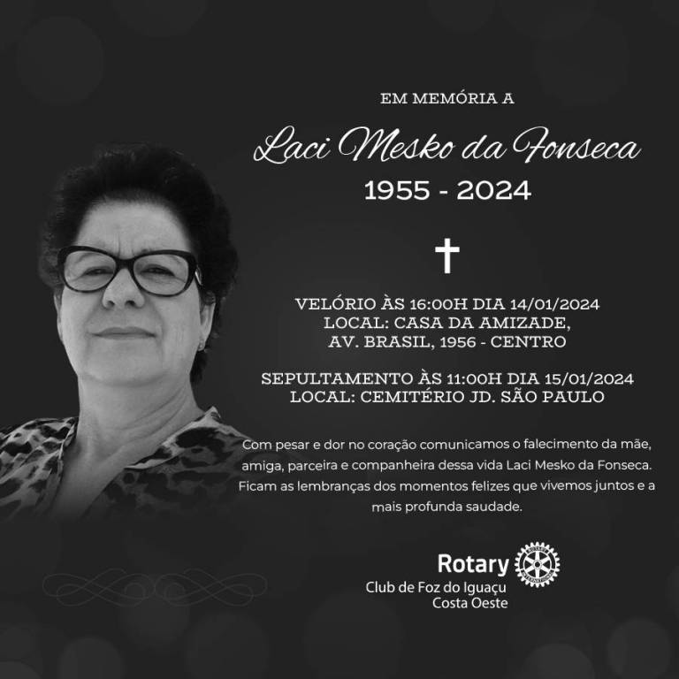 Rotary Club de Foz do Iguaçu-Costa Oeste comunica o falecimento da companheira Laci Mesko da Fonseca - 1955-2024.