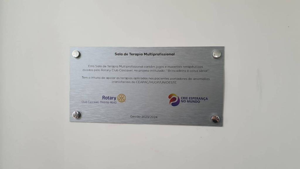O ROTARY CLUB DE CASCAVEL, entregou ao Centro de Atenção e Pesquisa em Anomalias Craniofaciais - CEAPAC do Hospital Universitário do Oeste do Paraná – HUOP, o projeto “Sala de terapias multiprofissionais: Brincadeira é coisa séria, contendo brinquedos e equipamentos terapêuticos que são peças fundamentais para a evolução e recuperação de cada paciente. O projeto distrital foi feito em parte pelos recursos da Fundação Rotária do Rotary Internacional e complementado com recursos do Rotary Club de Cascavel. Estiveram presentes o diretor geral do HUOP, Rafael de Oliveira, a coordenadora do CEAPAC, Mariângela Baltazar, o Governador Assistente da área IX Arildo Hank, o presidente do Rotary Club de Cascavel, Marcelo Palma, demais companheiros do clube e a presidente da comissão distrital da Fundação Rotaria, Distrito 4640, Sonia Taube Linero. Foi destacado que esta doação ajuda a mudar muitas vidas e desempenha um papel crucial no tratamento dos pacientes, especialmente para os pequenos, que estão em recuperação e reaprendendo a mastigar corretamente os alimentos. E assim os rotarianos, continuam criando esperança no mundo.