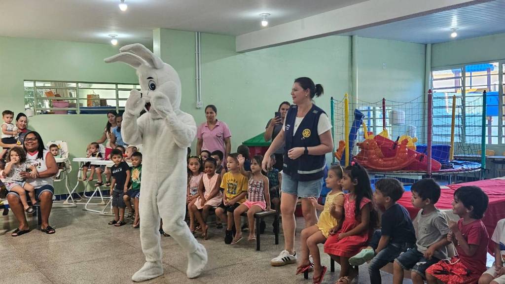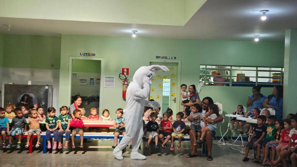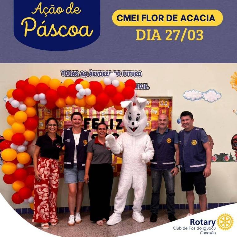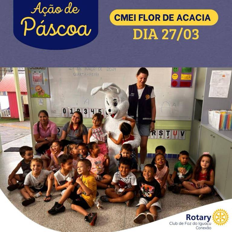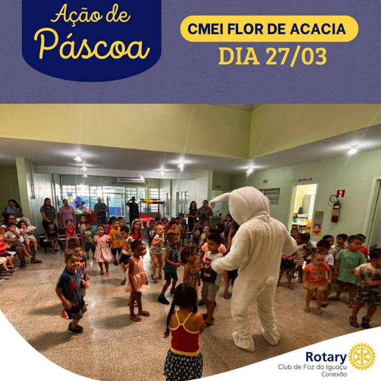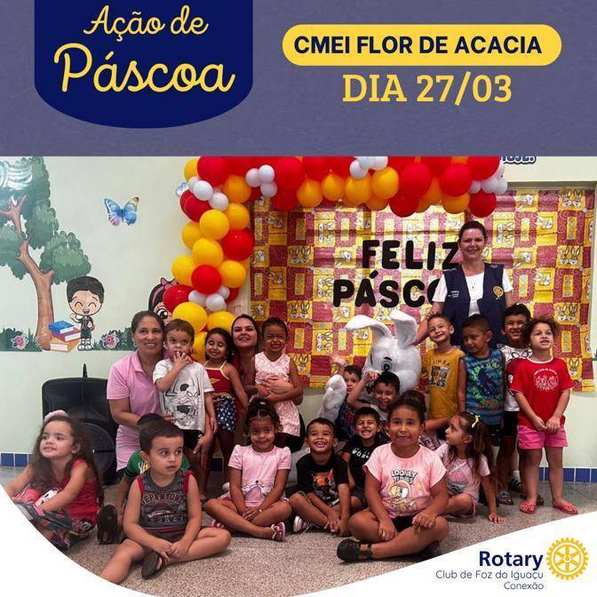 REALIZAÇÃO DO RCFI CONEXÃO DE AÇÃO DE PÁSCOA NO CMEI FLOR DE ACÁCIA, ONDE 184 CRIANÇAS FORAM PRESENTEADAS COM COP KEIKS E A PRESENÇA DO COELHINHO, COM A PARTICIPAÇÃO DE TODOS OS COMPANHEIROS.