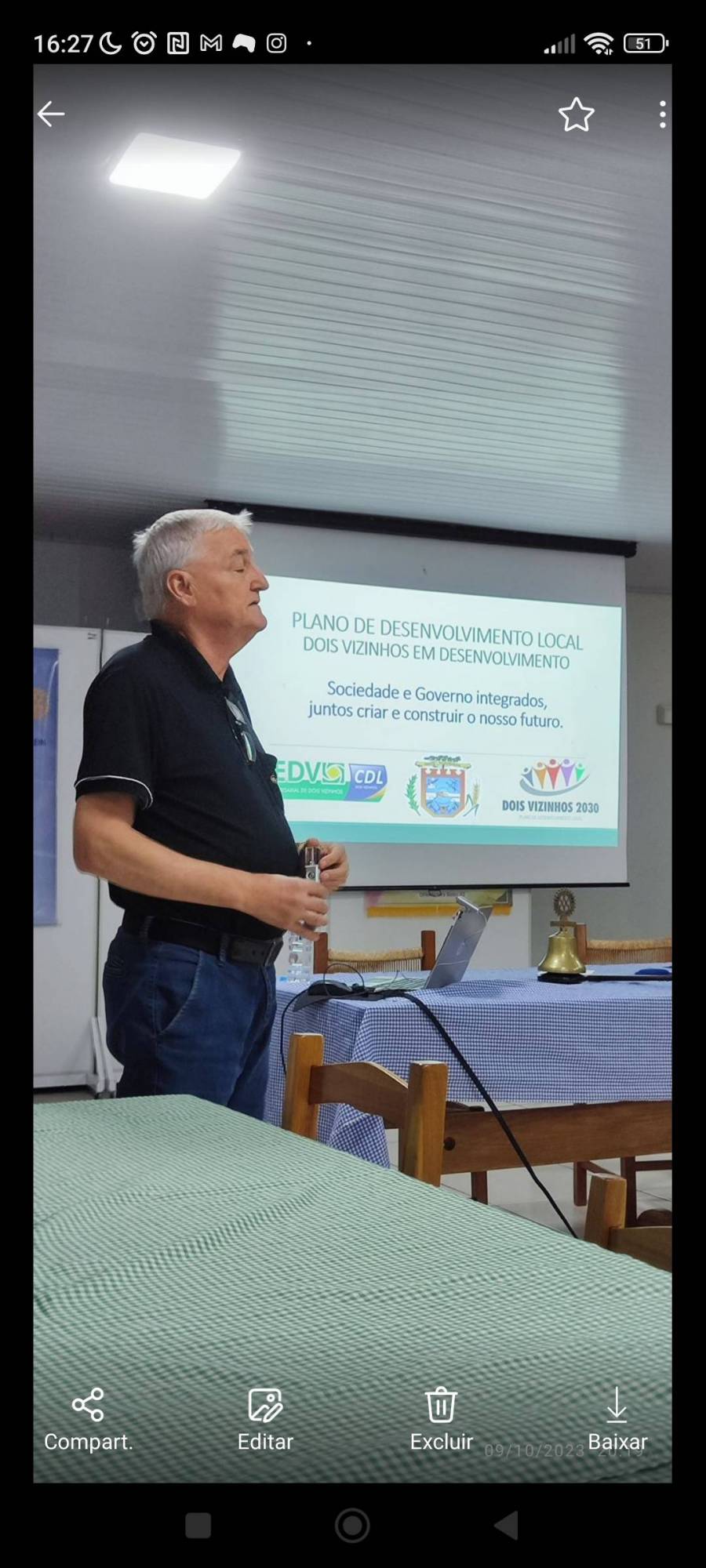 Na reunião da noite de 09/10/2023, foi ministrada um palestra com o SR. Luiz Carlos Peretti, na oportunidade falou sobre os desafios para implantar o plano de ação em nossa cidade.