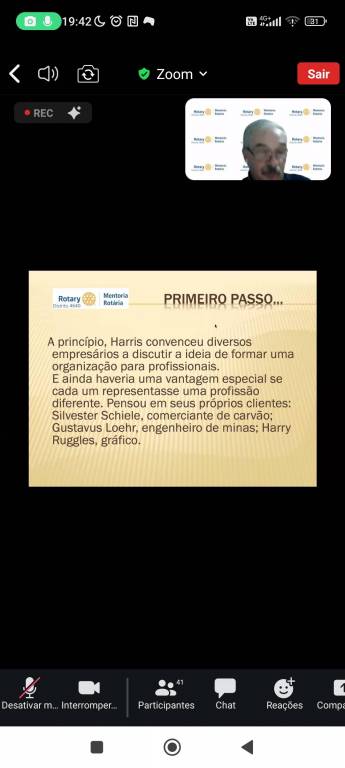 Participação na apresentação online do Distrio 4640, e na reunião dia 26/02/2024, foi comemorado os 119 anos de fundação do Rotary Internacional, na ocasião o instrutor do clube, falor sobre a fundanão do Rotary e seus 119 anos.
