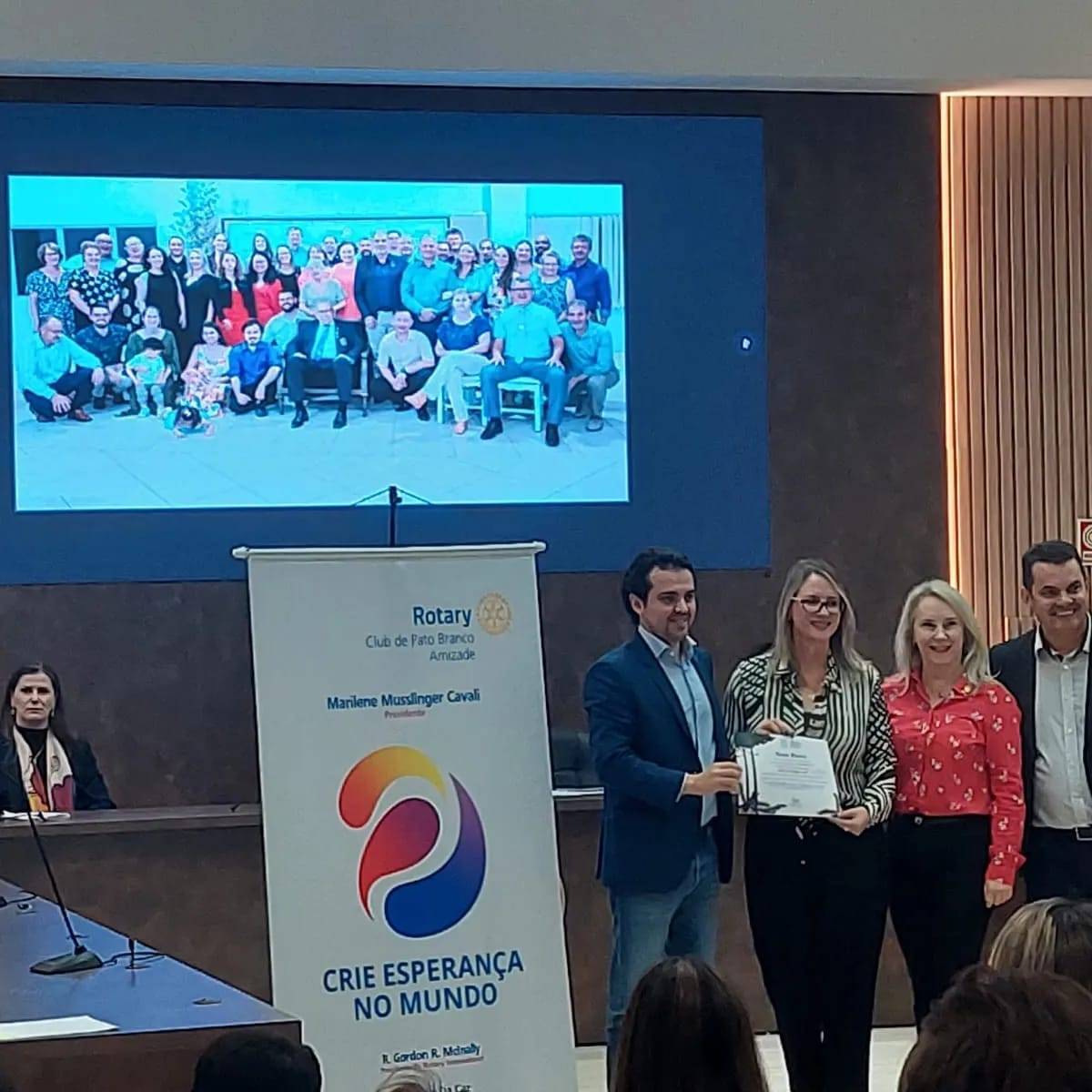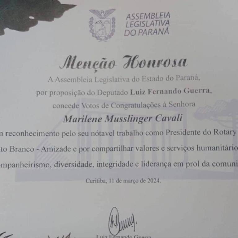 No dia 18 de abril, a Presidente do Rotary Club de Pato Branco-Amizade, Marilene Musslinger Cavali, foi agraciada com uma Menção Honrosa pela Assembleia Legislativa do Estado do Paraná. A honra foi concedida por meio de uma proposição do deputado Luiz Fernando Guerra, em reconhecimento ao excepcional trabalho desempenhado como presidente. A homenagem também destaca sua dedicação em compartilhar valores fundamentais e serviços humanitarios, união, companheirismo, diversidade, integridade e liderança, em benefício da comunidade.