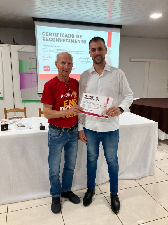 Roraty Cluby de Dois Vizinhos-Amizade realiza reunião ordinária com festiva de aniversário do cluby e reconhecimento aos doadores da pólio. A noite foi para relembrar os marcos históricos do Rotary no mundo e o aniversário de 28 anos do cluby, como parte da comemoração foi primordial agradecer aos convidados e doadores da pólio que na ocasião receberam o certificado de reconhecimento como doadores oficiais da pólio.