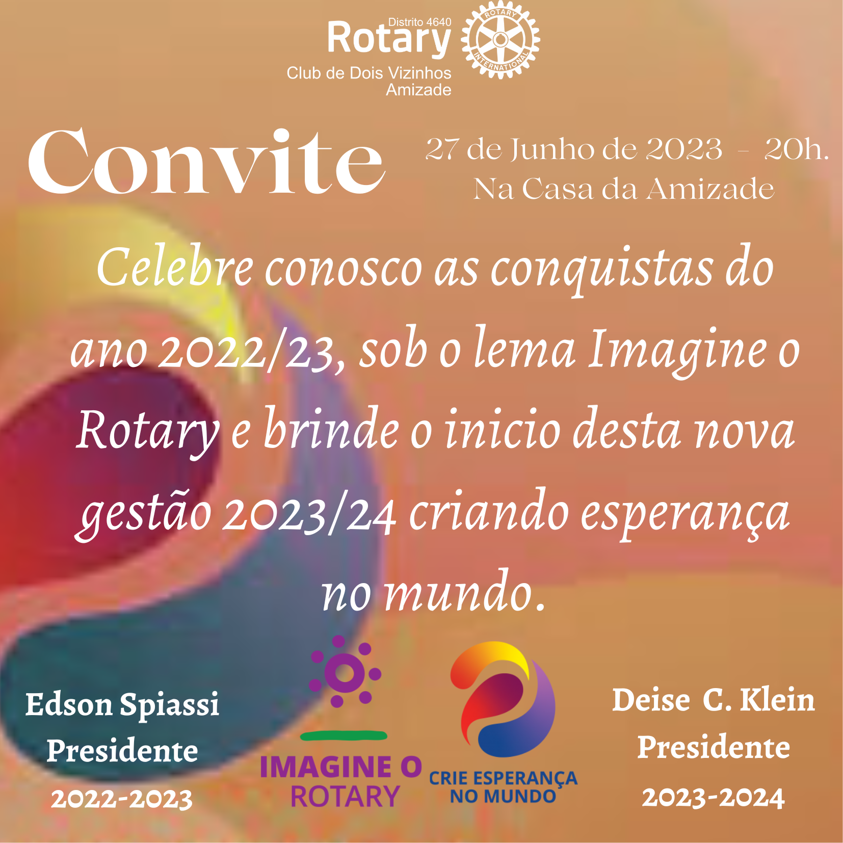 Celebre conosco as conquistas do ano 2022/23, sob o lema Imagine o Rotary e brinde o inicio desta nova gestão 2023/24 criando esperança no mundo.