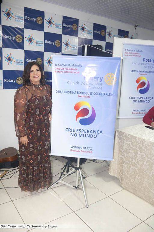Sob o lema Crie Esperança no mundo a Rotariana Deise Cristina Rodrigues Colaço Klein, assumiu a presidencia do Rotary Club de Dois Viznhos-Amizade para o ano rotario 2023/2024 que vinha sendo conduzido pelo rotariano Edson Spiassi. A festiva contou com a presença da Governadora 2022/2023 Anne Cristine Gomes da Silva Cavalli, do Governador Assistente da Área 18 2023/2024 Wilian Ivo Pastro, convidados do distrito, rotarianos e familiares e representantes de instituiçoes parceiras do Rotary.