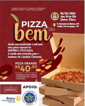 Neste evento da Pizza do Bem, do Rotary Clube Grande Lago, muitas pessoas estão envolvidas para fazer acontecer, e a participação de todos é fundamental para que o sucesso seja alcançado, e essa participação, significa a multiplicação das ações individuais em uma ação conjunta e grandiosa, capaz de surpreender até mesmo os mais céticos.
