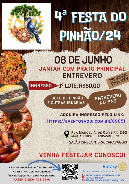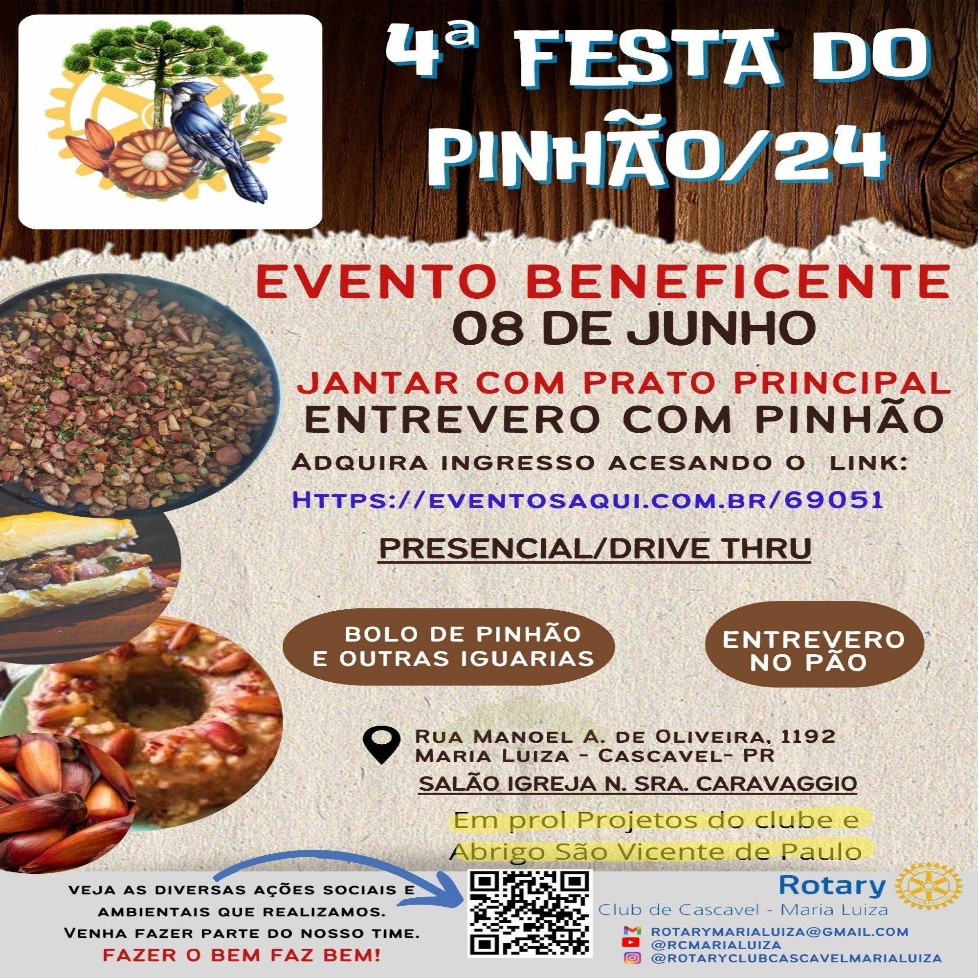 A 4ª Festa do Pinhão acontecerá no dia 08 de junho e contará com comida típica ENTREVERO COM PINHÃO, além de muitas delícias feitas com pinhão. Aberto ao público o salão da Igreja Nossa Senhora de Caravaggio contará com barracas vendendo produtos à base de pinhão para serem consumidos na hora ou para levar para casa. RESERVE ESTA DATA. Ingressos à venda no site OKIngressos. Acesse o link e confira https://eventosaqui.com.br/69051