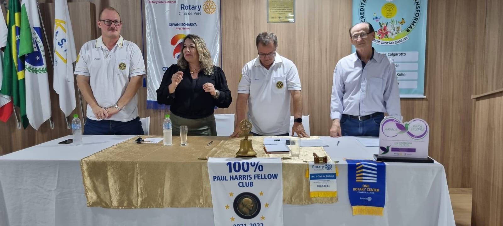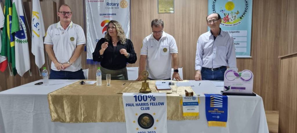 Tivemos em nossa Reunião Festiva a visita da Ilustre Governadora 2022/2023 Anne, que pós a formalidade da reunião festiva usou a palavra. Anne com muita emoção veio nos entregar em mãos mais uma flâmula da fundação Rotária, referente as doações do ano 2022/2023. Em 2021/2022 o Rotary club de Verê recebeu do Governador Sergio Bassegio a flâmula de primeiro lugar em doação para a FR, doando o montante de U$ 9.161 dólares. Em seu ano Rotário 2022/2023, O Rotary Club de Verê atingiu a doação de U$ 12.878 dólares, ficando em segundo lugar no distrito, ficando a somente U$ 300 dolares do primeiro colocado, porém atingindo um fato inédito ao Distrito, primeiro lugar em doação per capita para a FR, e a maior doação per capita feita por um clube de Rotary ao distrito 4640. Os companheiros receberam a flâmula com muito carinho, relembrando as ações que resultaram nesta doação, que foi a Live com a dupla Luizinho e Rosangela realizada no GATS da Governadora Anne. Em forma de carinho e gratidão, Governadora Anne também trouxe diretamente de Evanston, Illinois, a raríssima flâmula ONE ROTARY CENTER, momento muito importante e gratificante ao RC de Verê. Finalizando, Governadora Anne agradeceu em especial aos companheiros do RC de Verê por fazerem a diferença no seu ano rotário, pelos méritos recebidos, prêmios, doações realizadas, e por serem exemplo de clube ao distrito 4640, deixando seu fraternal abraço.