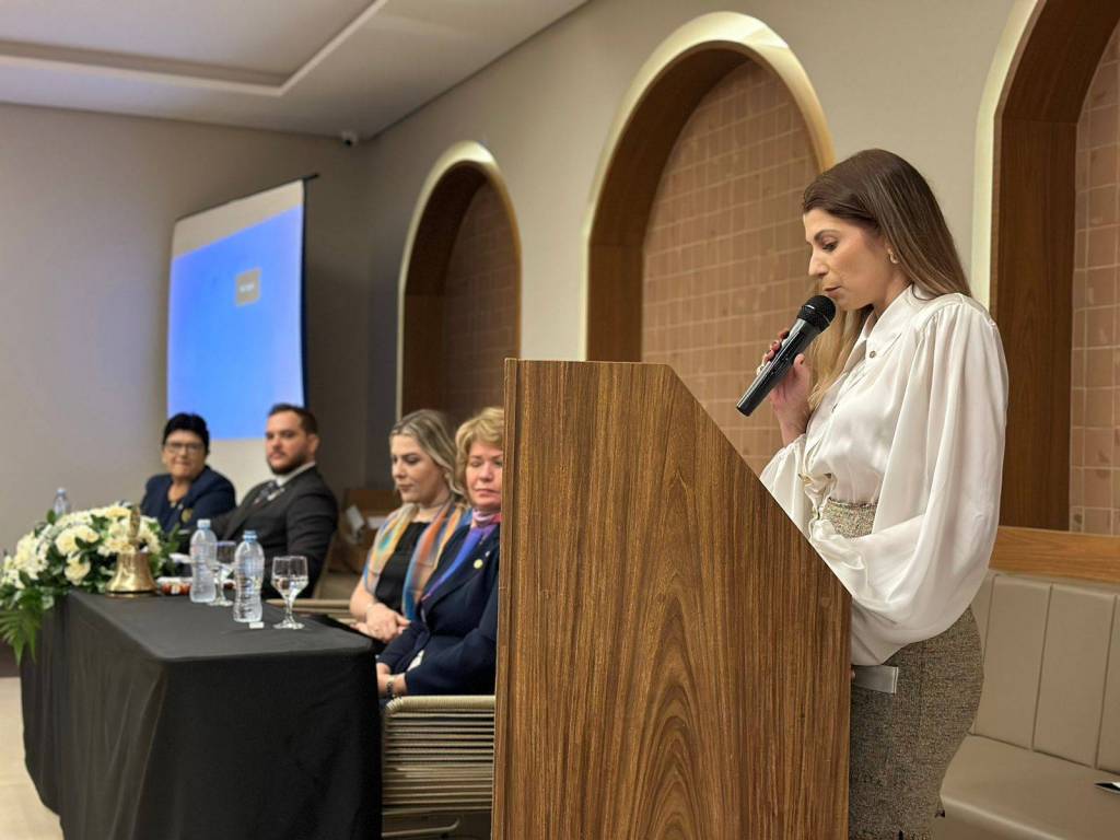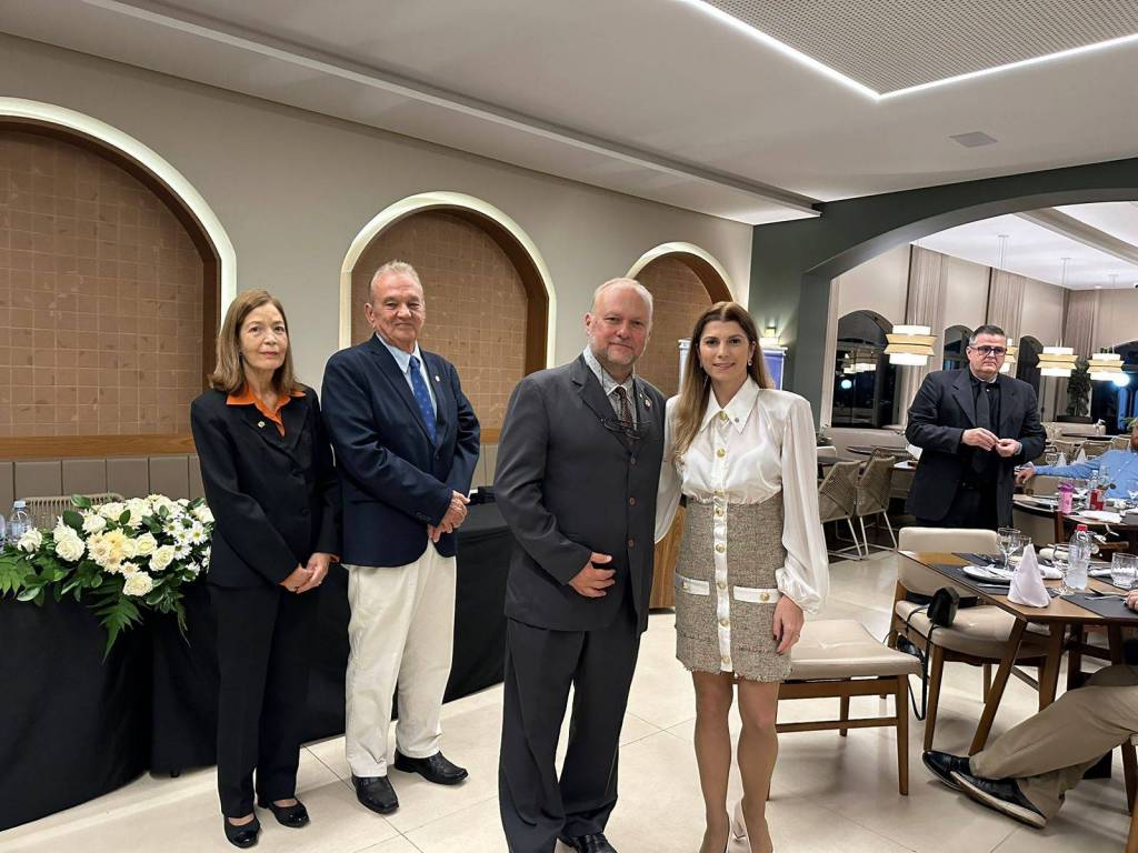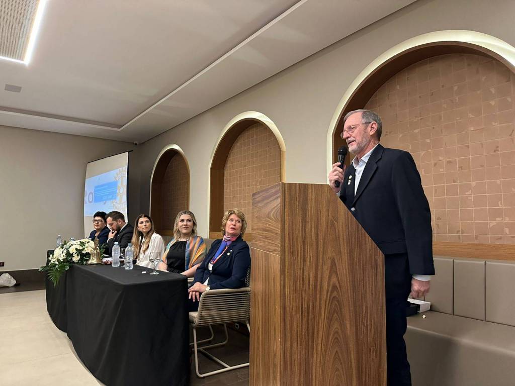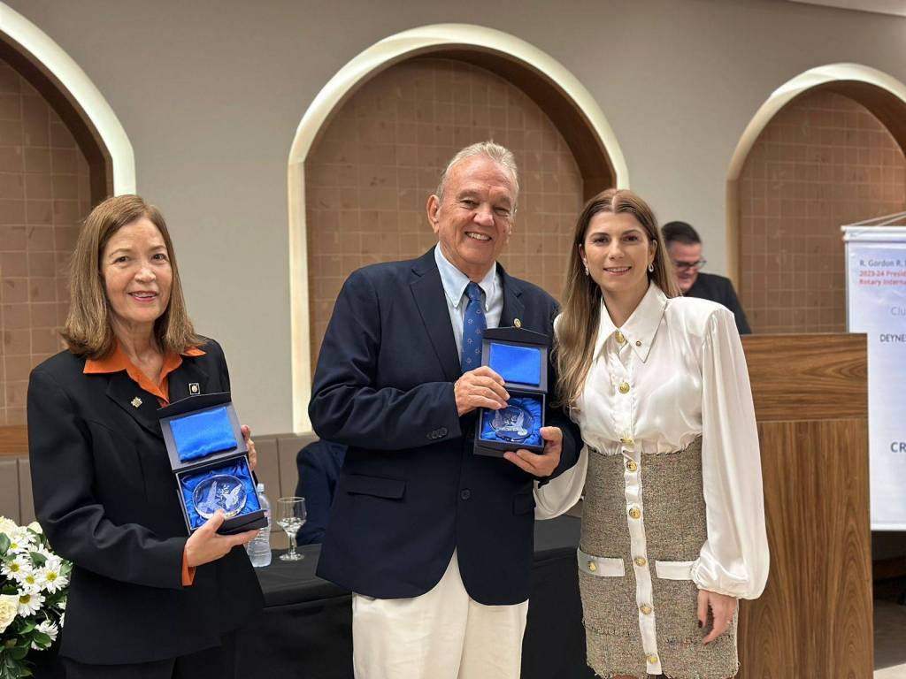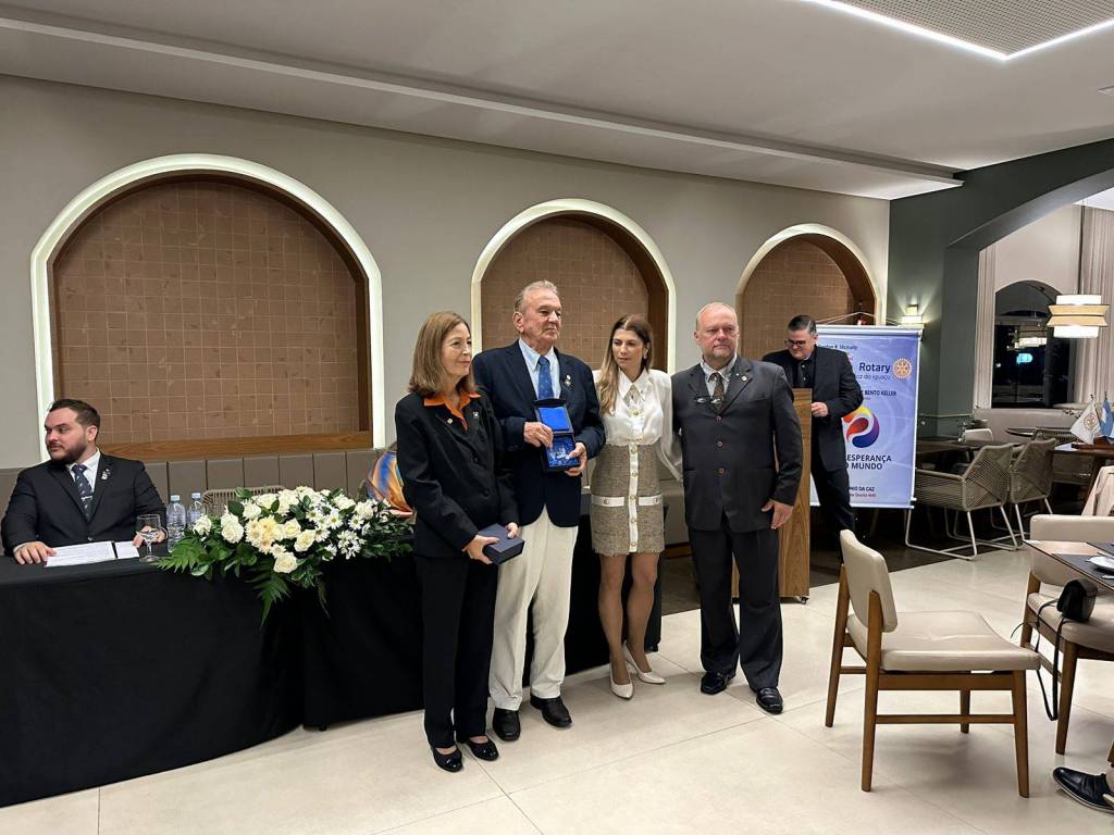 A presidente do Rotary Club de Foz do Iguaçu 2023-2024, Deynes Grasiele Keller, teve a honra de entregar os títulos Paul Harris com segunda Safira e o título Major Donor aos homenageados, destacando a importância das doações dos companheiros Paulo Chamorro e Luiz Gomes, que além de extremamente importantes para o sucesso do Rotary ajudam na construção de um mundo melhor.