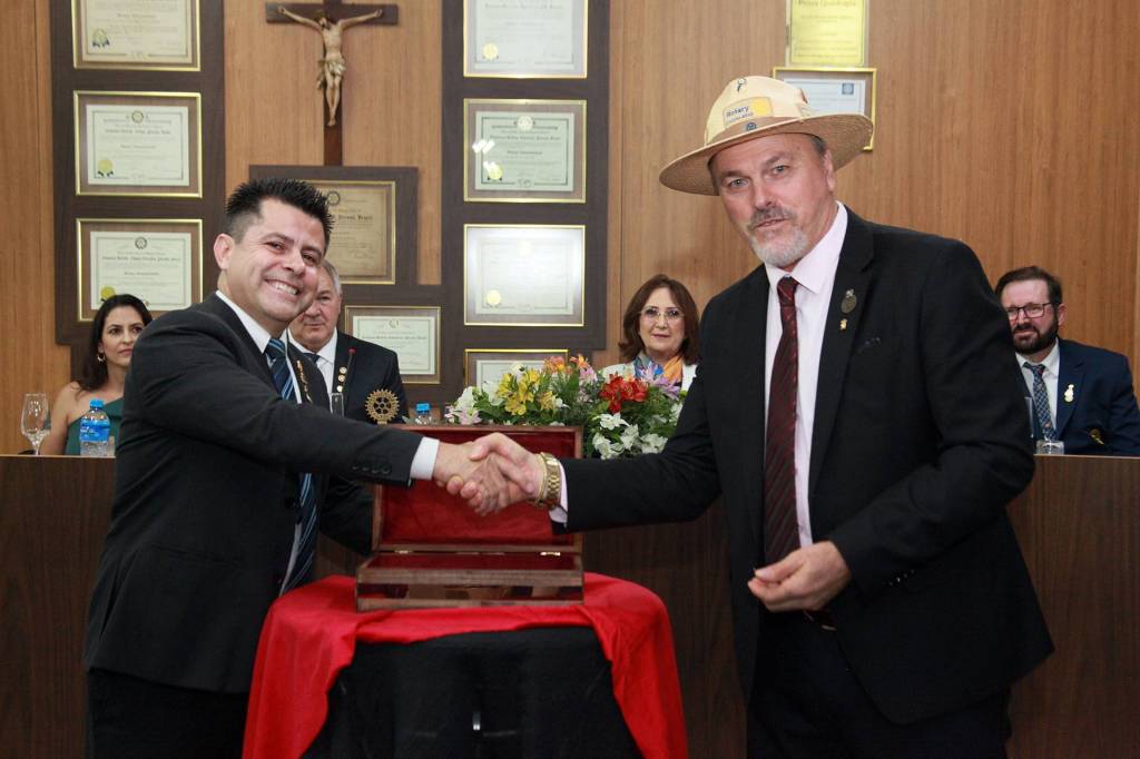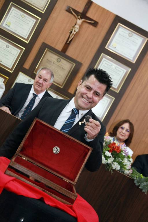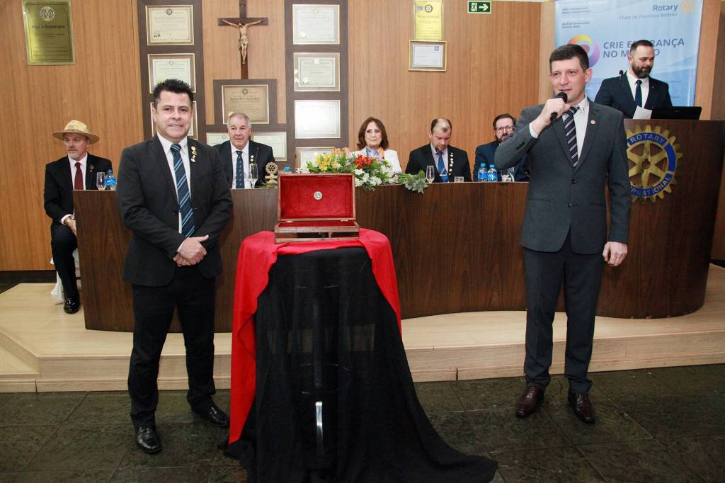 NA SEQUÊNCIA, O NOVO PRESIDENTE, ANTONIO ANDRETTA NETO, FOI OFICIALMENTE EMPOSSADO, RECEBENDO OS SÍMBOLOS TRADICIONAIS DO CARGO, COMO O SINO E O MARTELO. EM SEU DISCURSO DE POSSE, ANTONIO ANDRETTA NETO, PARABENIZOU O COMPANHEIRO EDSON ADRIANO PELO EXCELENTE TRABALHO REALIZADO, EXPRESSOU SUA GRATIDÃO PELA CONFIANÇA DEPOSITADA E APRESENTOU SUA PLATAFORMA DE ATIVIDADES PARA O PRÓXIMO ANO.